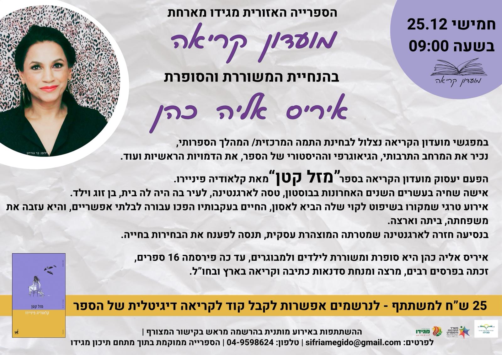 בהנחיית הסופרת והמשוררת איריס אליה כהן. המפגש יעסוק ב״מזל קטן״ מאת קלאודיה פיניירו. לנרשמים אפשרות לקבל קוד לקריאה דיגיטלית של הספר.